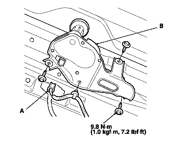 3. Disconnect the 4P connector (A), from the rear window wiper motor (B).