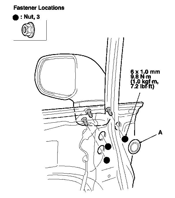 5. While holding the mirror (A), detach the clip (B), then remove the mirror, and pull the harness (C) out through the hole in the door. Take care not to scratch the door.