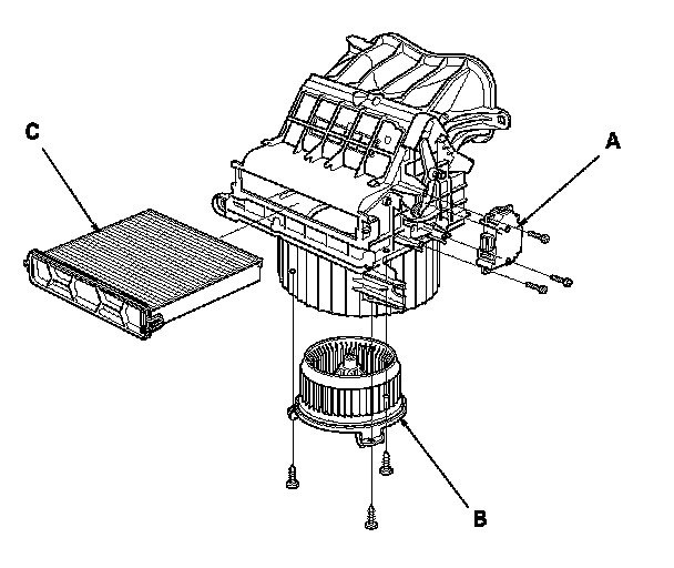 - The recirculation control motor (A), the blower motor (B), and the dust and pollen filter (C) can be replaced without removing the blower unit.