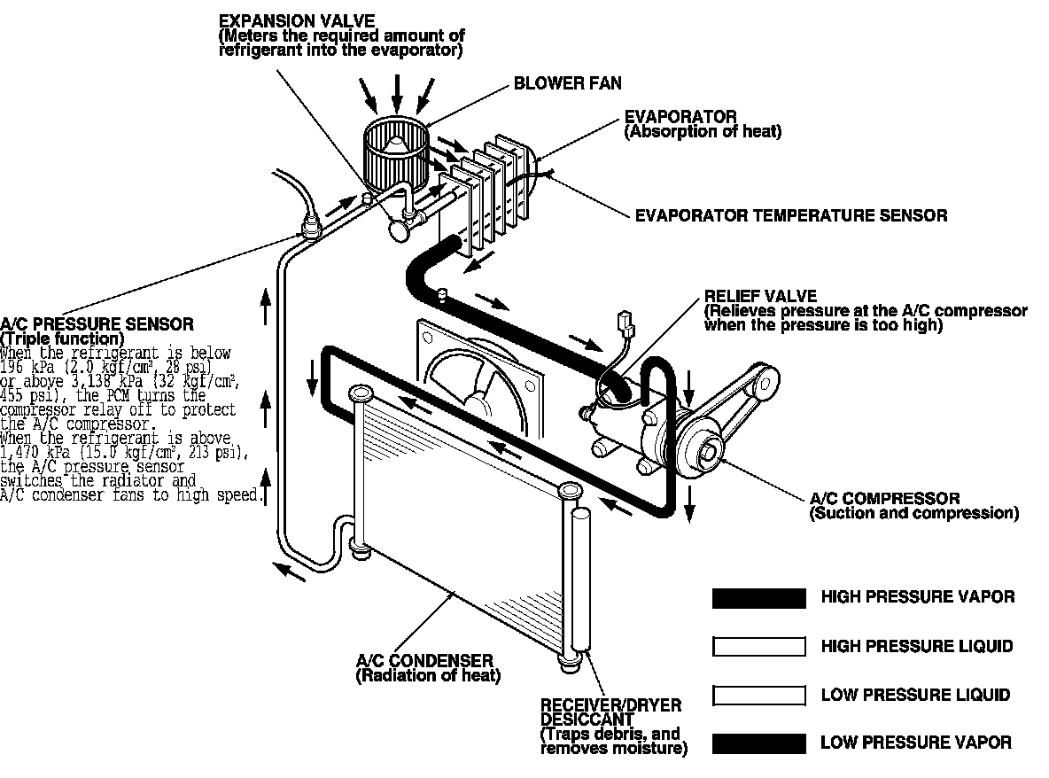 - All A/C system parts (A/C compressor, discharge line, suction line, evaporator, A/C condenser, receiver/dryer, expansion valve, O-rings for joints) are designed for refrigerant R-134a. Do not exchange with R-12 parts.