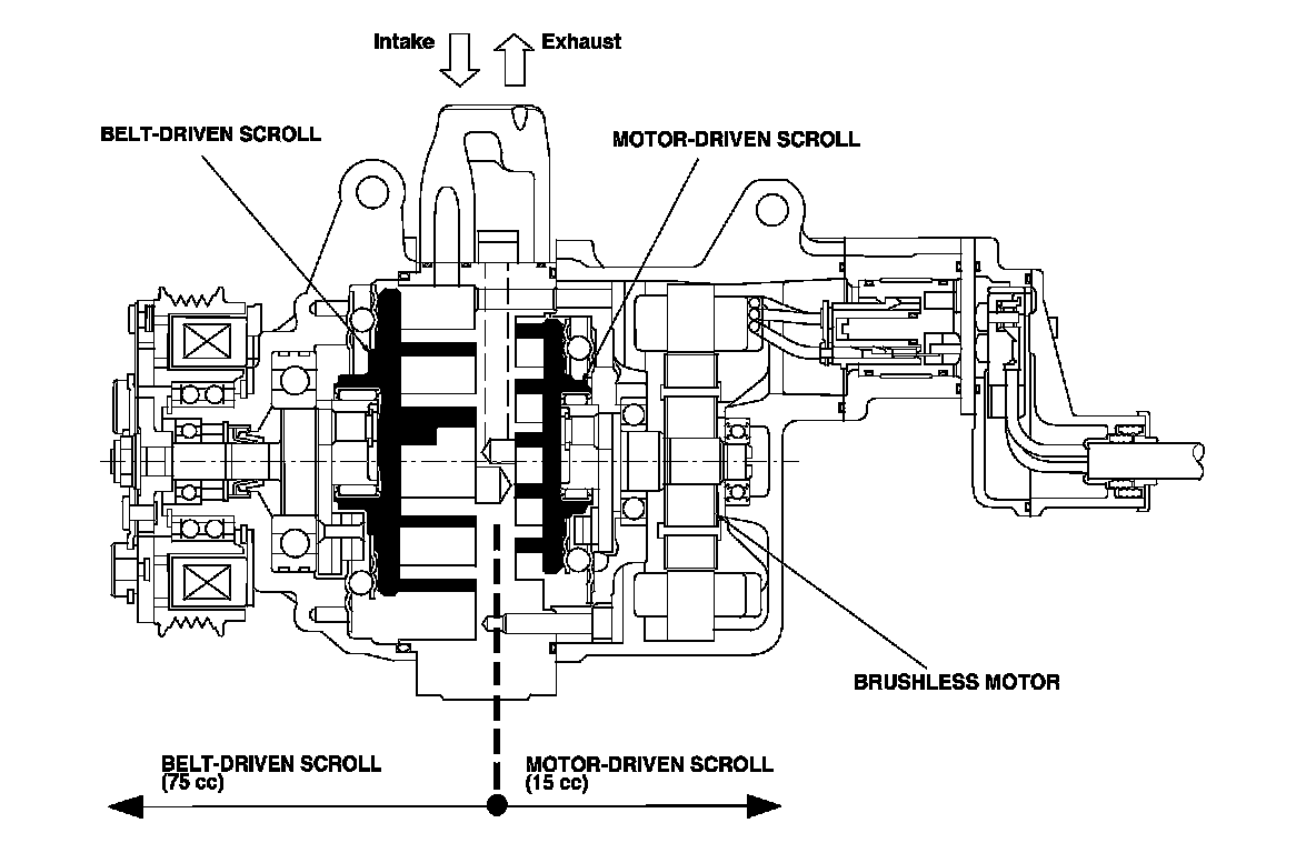 The dual scroll hybrid compressor is a twin chamber dual compressor, that can use both mechanical (belt-driven) and electric power (motor-driven) to compress refrigerant.