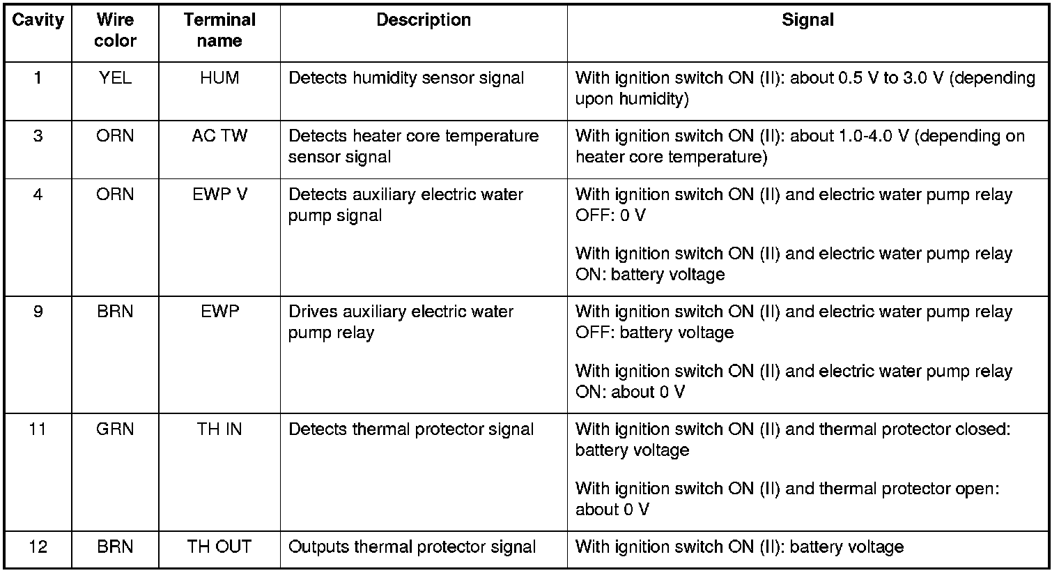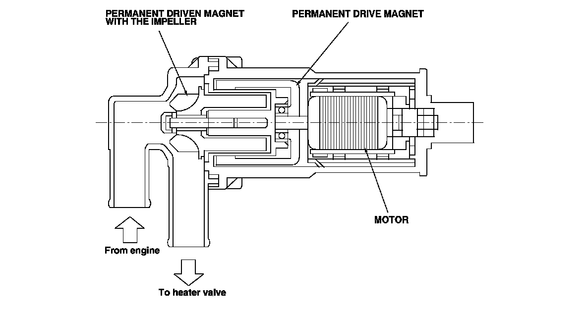 The climate control unit operates the pump, based on an idle stop signal from the PCM. The pump maintains heater temperature during idle stop. However, using hot coolant from the engine will cool the engine. If the ECT temperature drops below a predetermined setting the engine will restart. There is also a temperature sensor located at the heater core. It is used to monitor the auxiliary electric water pump operation. If the pump fails, the temperature sensor detects rapid cooling of the heater core. In addition, the auxiliary electric water pump connector includes a second set of contacts to establish continuity through the connector. If these contacts open, the climate control unit will set a DTC.