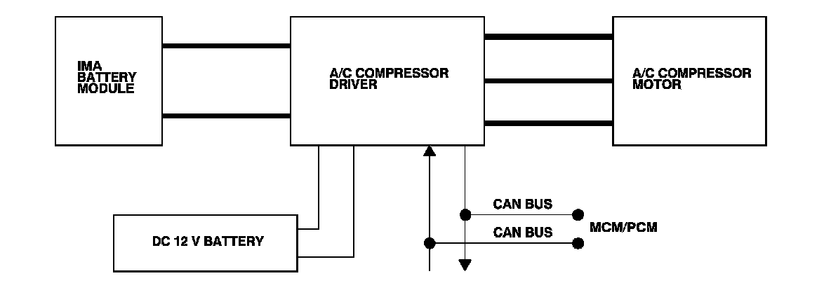The A/C compressor driver supplies the A/C motor compressor with switched high voltage from the IMA battery module. The A/C compressor driver receives signals from the MCM/PCM and the HVAC climate control panel through a CAN Bus, which the compressor driver uses to match A/C compressor speed to the driving conditions and the cooling request. In case of a system failure the A/C compressor driver will communicate a DTC through the CAN Bus. The DTC is displayed through the HVAC and/or the IMA system depending on the failure.