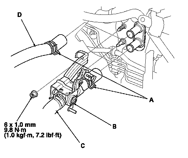 6. Slide the hose clamps (A) back. Remove the nut and the water valve (B), then disconnect the inlet heater hose (C) and the outlet heater hose (D) from the heater unit. Engine coolant will run out when the hoses are disconnected; drain it into a clean drip pan. Be sure not to let coolant spill on the electrical parts or the painted surfaces. If any coolant spills, rinse it off immediately.