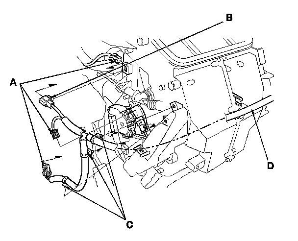 12. Disconnect the connectors (A) from the air mix control motor, the heater core temperature sensor, and the A/C wire harness. Remove the connector clip (B), the wire harness clips (C), and the wire harness (D).