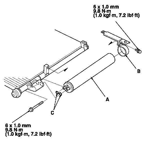 2. Remove the bolts from the A/C condenser, then remove the receiver/dryer (A), the bracket (B), and the O-rings (C).