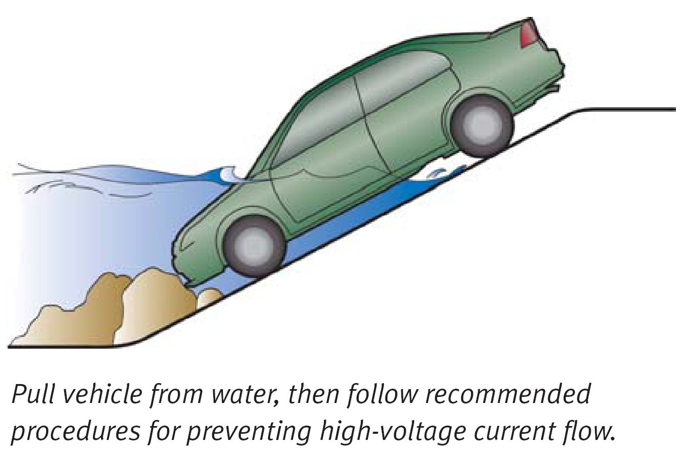 Pull the vehicle out of the water, then use one of the procedures described below for preventing electric current from flowing through the high-voltage cables. There is no risk of electric shock from touching the car's body or framework in or out of the water.