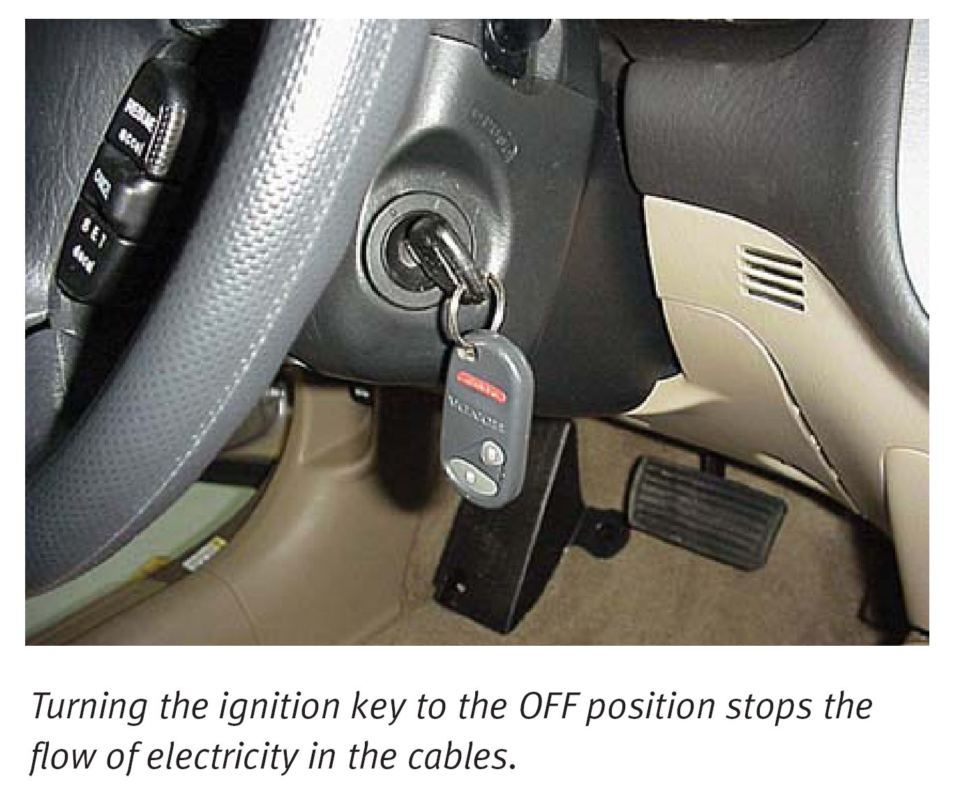 This simple action turns off the engine and the electric motor, preventing current flow into the cables. It also turns off power to the airbags and the seat belt tensioners, although it takes up to 3 minutes for these to depower.