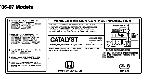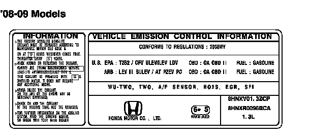 THIS VEHICLE CONFORMS TO U.S. EPA TIER 2 BIN 2 AND CFV ULEV REGULATIONS APPLICABLE TO 2006 MODEL YEAR NEW PASSENGER CARS AND CALIFORNIA REGULATIONS APPLICABLE TO 2006 MODEL YEAR NEW LEV II SULEV PASSENGER CARS. THIS VEHICLE HAS ALSO BEEN CERTIFIED AS AN AT-PZEV BY CALIFORNIA AIR RESOURCES BOARD. EPA CERTIFICATION TEST FUEL FOR CFV: EPA UNLEADED GASOLINE.