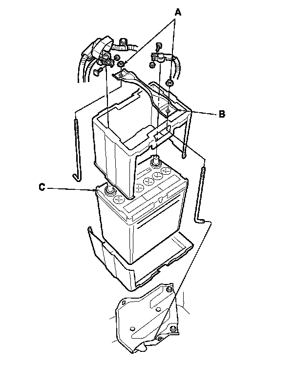 2. Remove the two nuts (A) securing the battery setting plate, then remove the battery setting plate (B) and the battery (C).