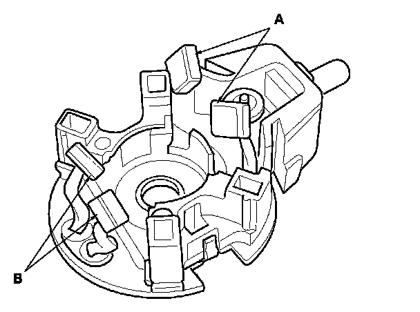 12. Check for continuity between the (+) brushes (A) and the (-) brushes (B). If there is continuity, replace the brush holder assembly.