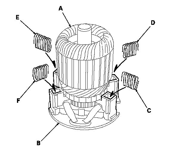 18. While squeezing a spring (C), insert it in the hole on the brush holder, and push it until it bottoms. Repeat this for the other three springs (D, E, and F).
