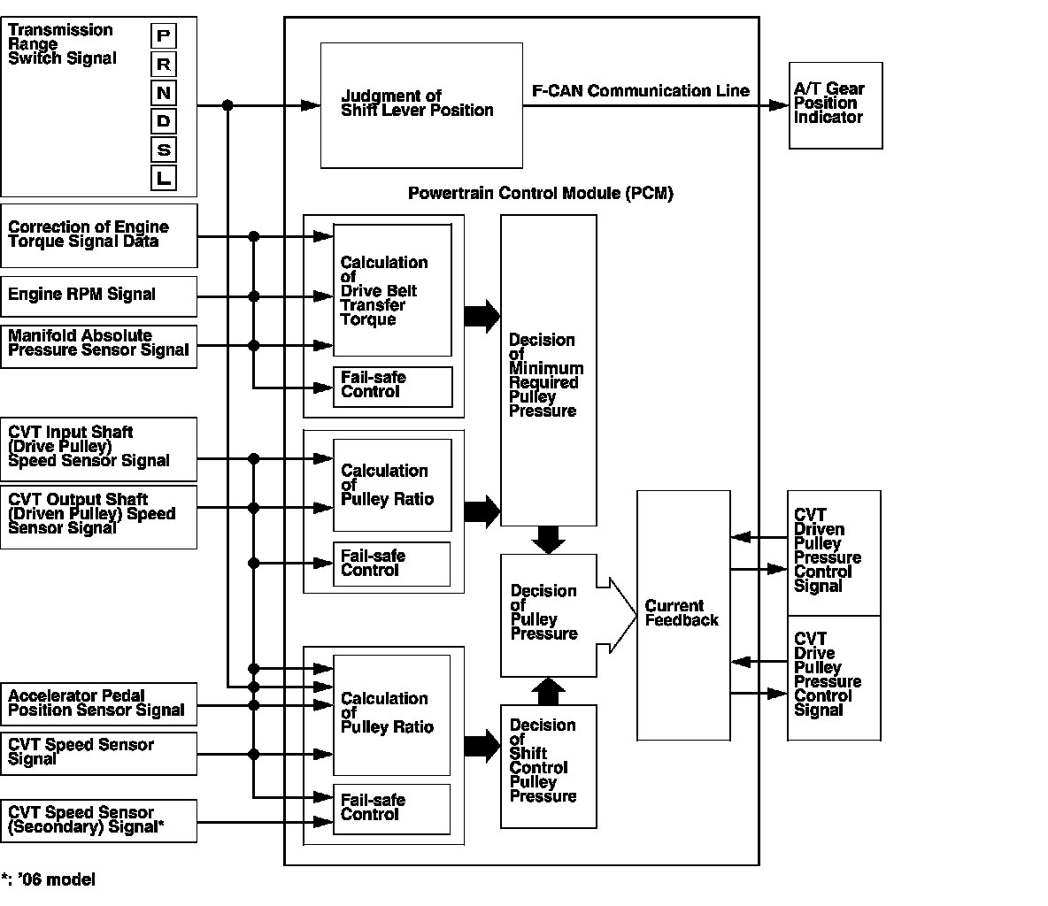 The PCM receives input signals from the sensors, switches, and other control units, processes data, and outputs signals for the engine control system and the CVT control system. The CVT control system includes shift control, pulley pressure control, start clutch pressure control, and reverse inhibitor control. The PCM actuates the pulley control solenoids to control pulley control valves A and B shifting transmission pulley ratios.