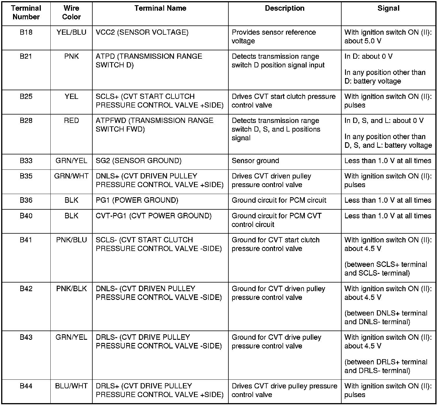 PCM CVT Control System Inputs and Outputs (cont'd)