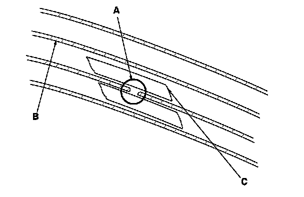 2. Carefully mask above and below the broken portion of the defogger wire (B) with cellophane tape (C).