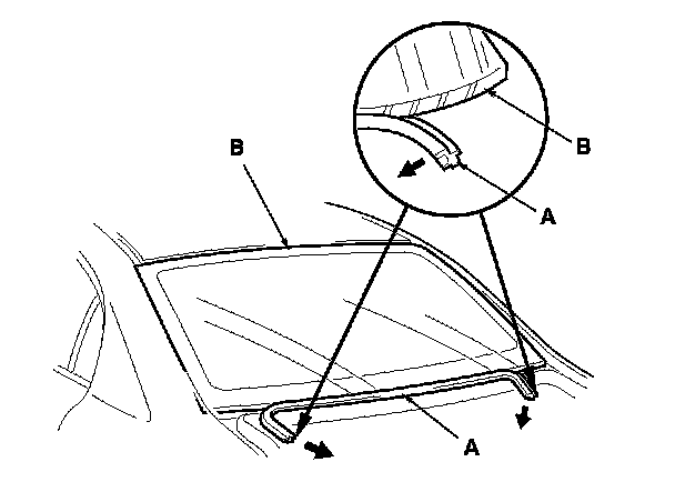 6. Remove the lower rubber dam (A) from the lower edge of the rear window (B). If necessary, cut the molding with a utility knife.