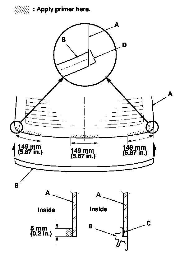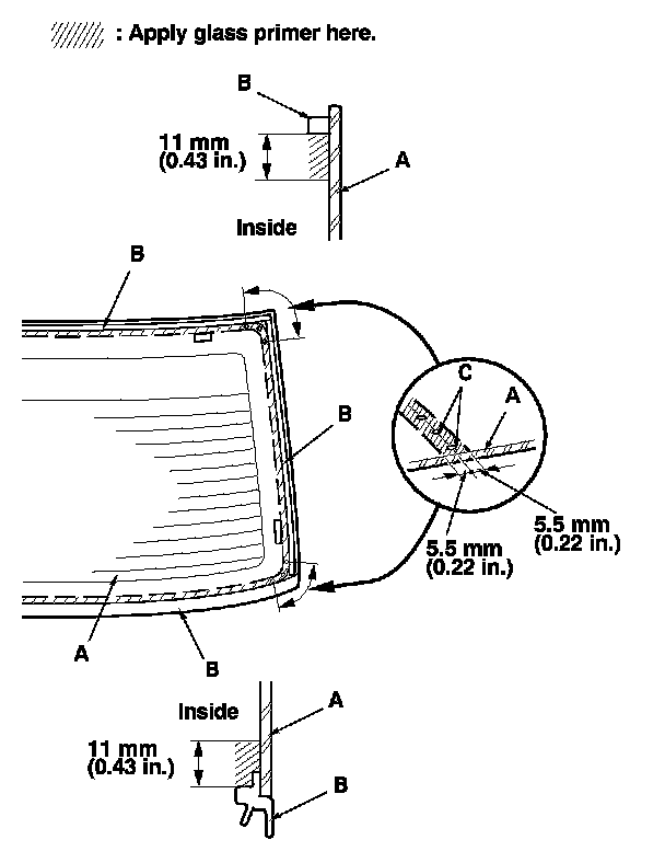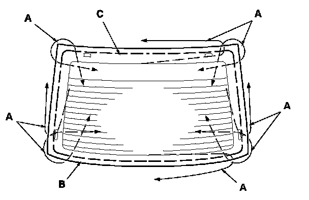 12. Apply primer to the edge of the rear window (A) where the lower rubber dam adhesive tape will be attached as shown. Attach the lower rubber dam (B) with adhesive tape (C) to the lower edge of the rear window: