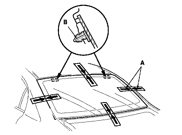 15. Set the rear window in the opening, and center it. Make alignment marks (A) across the rear window and the body with a grease pencil at the four points are shown: