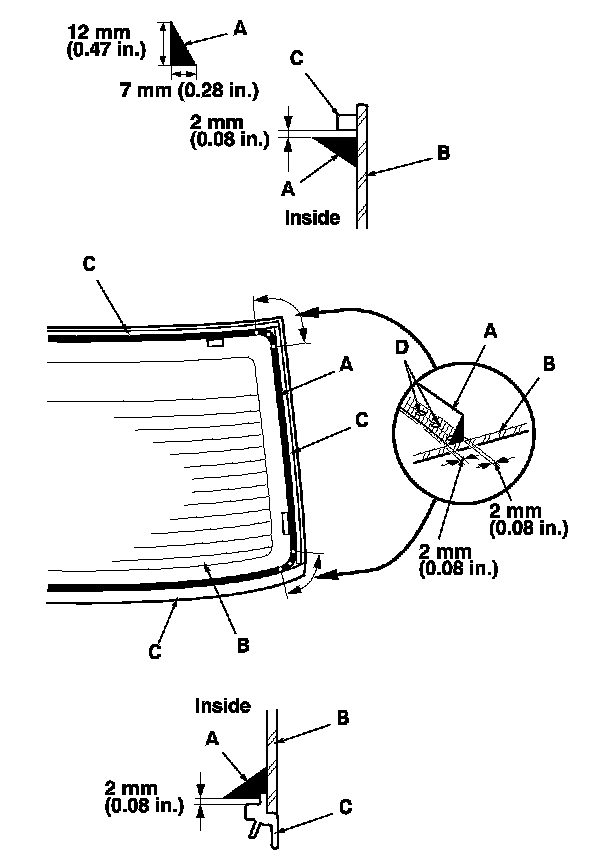 20. Put the cartridge in a caulking gun, and run a continuous bead of adhesive (A) around the edge of the rear window (B) between the dams (C) as shown: