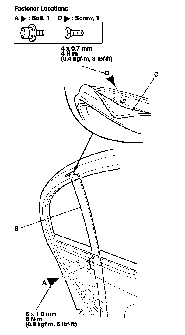 5. Remove the bolt (A) from the rear lower channel (B). Pull the glass run channel (C) away as needed, and remove the screw (D).