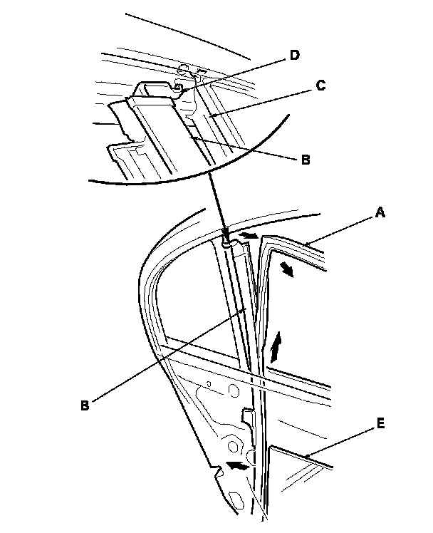 6. Pull the glass run channel (A) away as needed. Pull the rear lower channel (B) forward from the quarter glass seal (C), then release the upper hook (D) from the door. Remove the rear lower channel from the rear door glass (E), then pull the channel up to remove it.