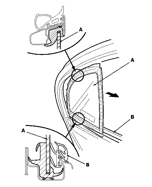 9. Remove the quarter glass (A). Take care not to damage the outer weatherstrip (B).