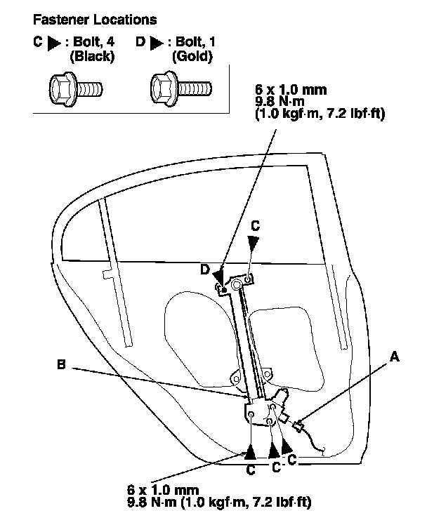 11. Remove the bolts (C), and loosen the bolt (D), then remove the regulator through the hole in the door.