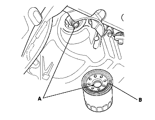 3. Inspect the threads (A) and rubber seal (B) on the new filter. Clean the seat on the oil pan, then apply a light coat of new engine oil to the filter rubber seal. Use only filters with a built-in bypass system.