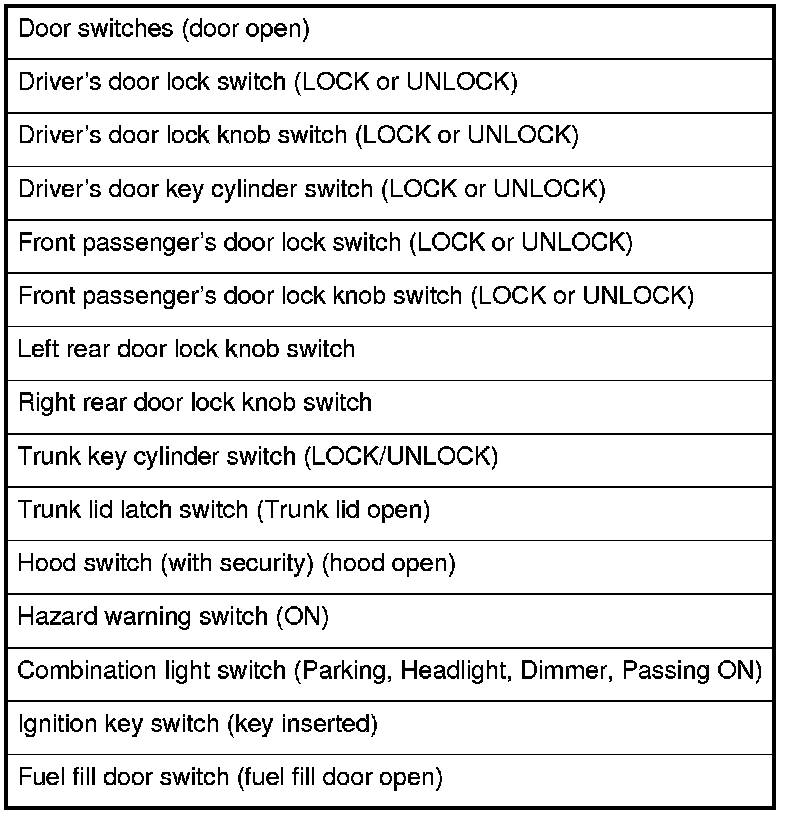 NOTE: If any control unit is faulty and will not wake up, several circuits in the system will malfunction at the same time. In the table, the control unit is followed by a list of the switches and input signals that can wake it up.