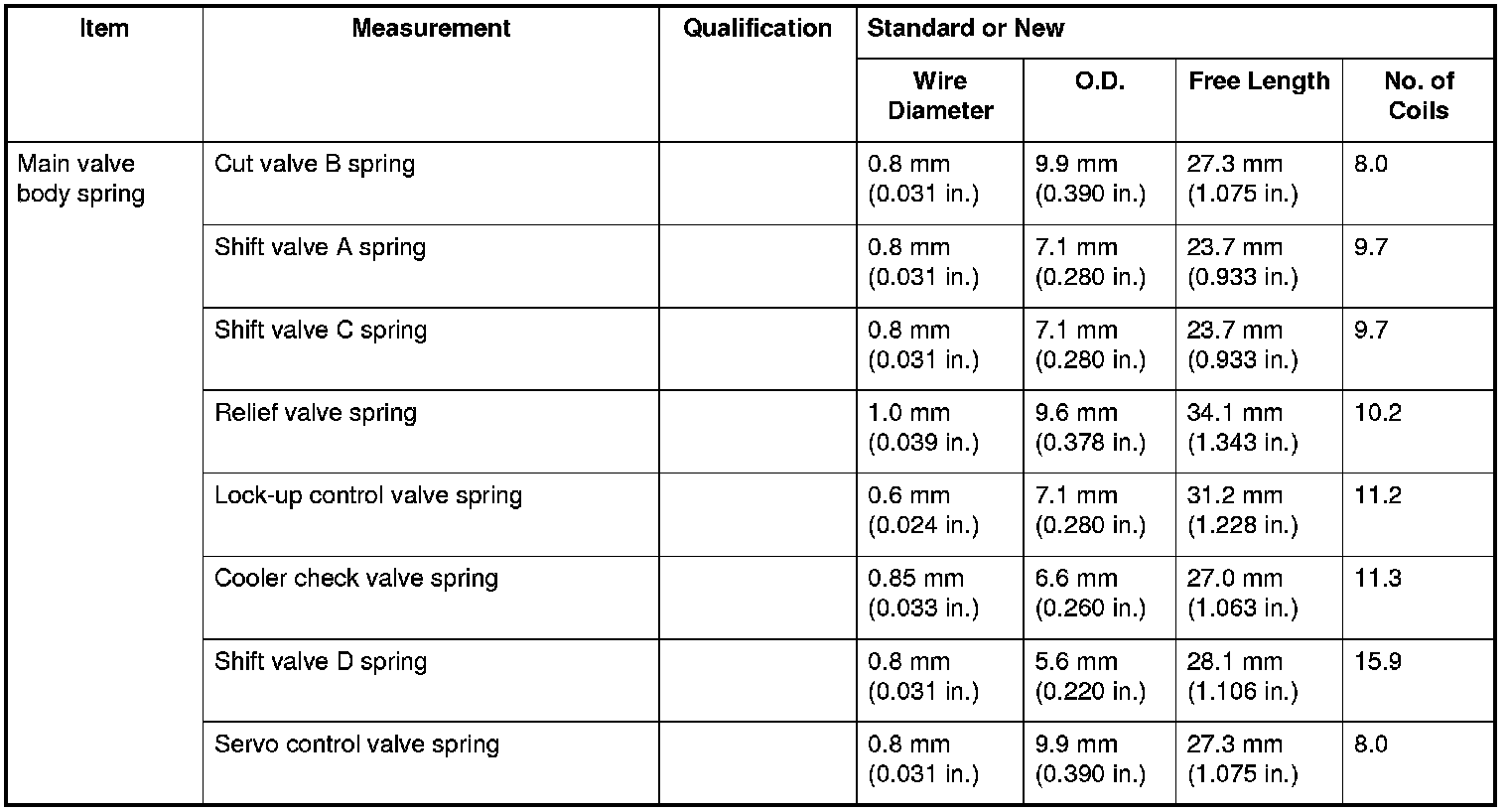Main Valve Body Spring Specifications