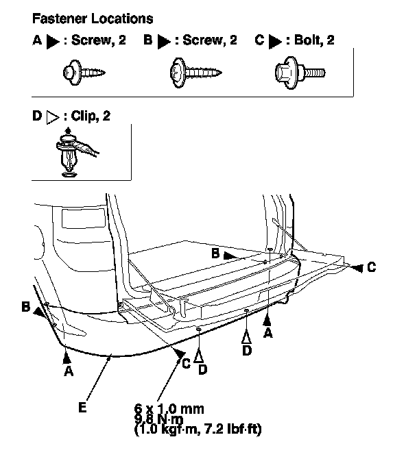 1. Remove the screws (A, B), the bolts (C) and the clips (D) securing the rear bumper (E).