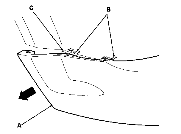 2. Pull on the rear bumper (A) at the wheel arch areas to release it from the hooks (B) on the upper bracket (C).