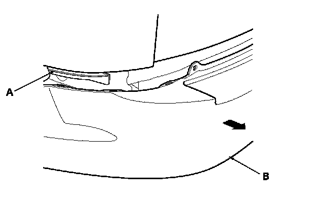 3. With the help of an assistant, pull the wheel arch portion away from the upper bracket (A), then pull out the rear bumper (B).
