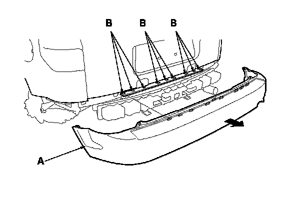 4. With the help of an assistant, pull out the rear bumper (A) to release the rear bumper from the hooks (B).