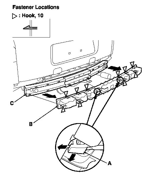 5. Release the hooks (A) on the underside of bumper absorber (B) with a flat-tip screwdriver, then detach the other retaining hooks. Pull out the rear bumper absorber to remove it from the rear bumper beam (C).
