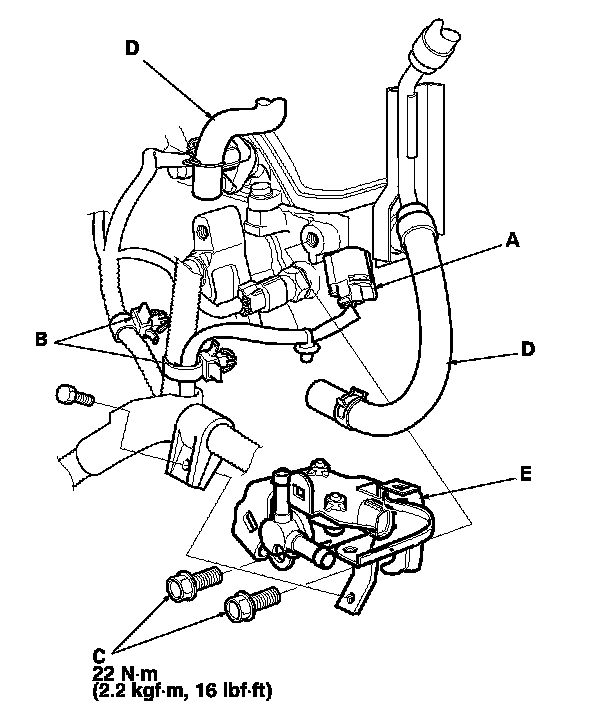 Remove the harness clips (B), the bolts (C), and the hoses (D), then remove the EVAP canister purge valve assembly (E).