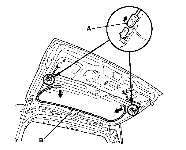 2. Disconnect the rear window defogger connectors (A), and remove the rear window trim (B).