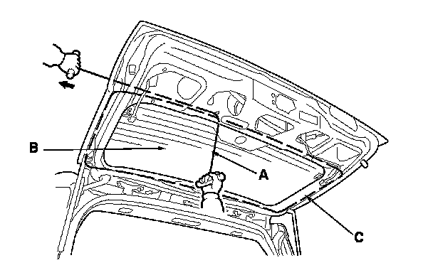 4. With a helper on the outside, pull the piano wire (A) back and forth in a sawing motion. Hold the piano wire as close to the rear window (B) as possible to prevent damage to the tailgate, and carefully cut through the adhesive (C) around the entire rear window.