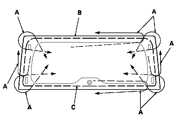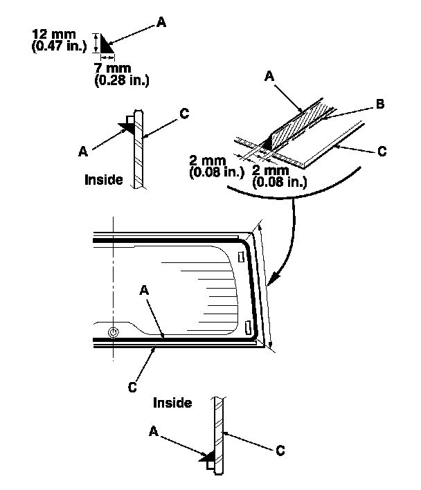 16. Put the cartridge in a caulking gun, and run a continuous bead of adhesive (A) on the glass primer trace (B) you applied on step 13, and around the edge of the rear window (C) as shown.