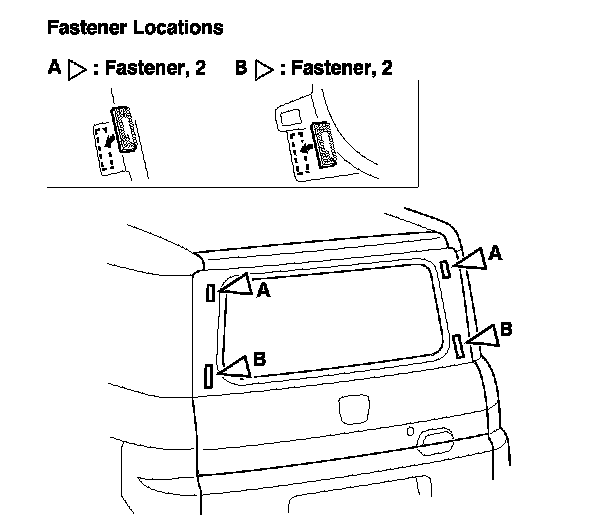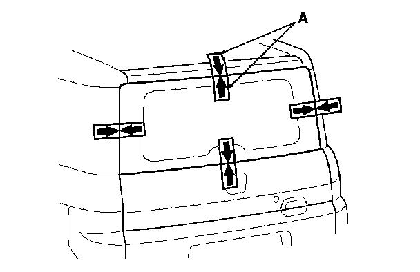 11. Set the rear window in the opening, and center it. Make alignment marks (A) across the rear window, tailgate, and body with a grease pencil at the four points shown. Be careful not to touch the rear window where adhesive is applied.