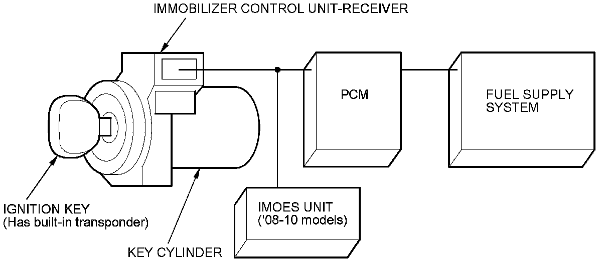 The vehicle is equipped with a type IV (GEN 3.5) immobilizer system that will disable the vehicle unless the proper ignition key is used. This system consists of a transponder located in the ignition key, an immobilizer control unit-receiver, an indicator, imoes unit ('08-10 models), and the PCM.