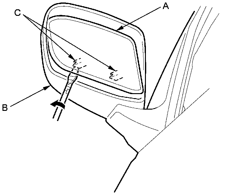 2. Put a shop towel in the opening between the lower edge of the mirror holder and the mirror housing (B) to prevent scratches, and detach the bottom clips (C) with a flat-tip screwdriver.