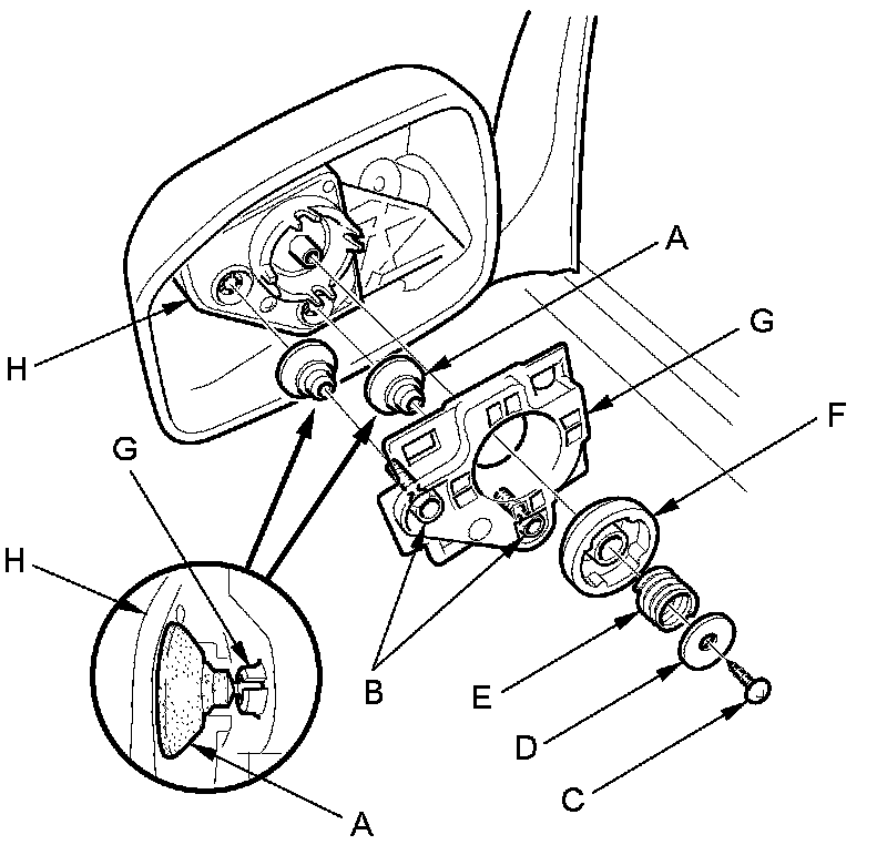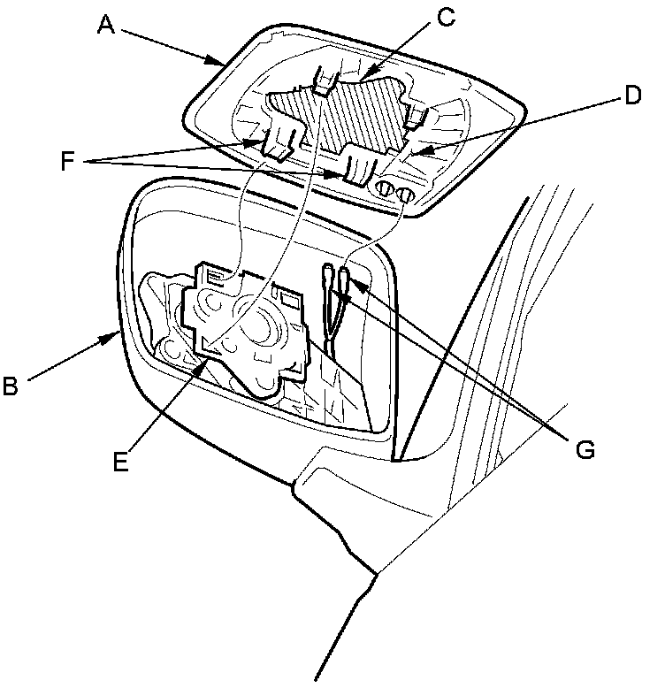 4. Separate the mirror holder from the actuator (E) by releasing the hooks (F). If equipped, disconnect the mirror defogger connectors (G).