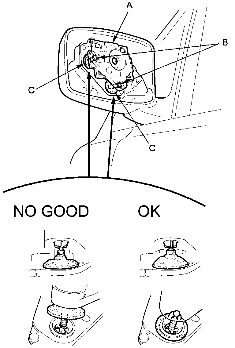 5. Before installing a new mirror holder to the actuator (A), check the actuator rods (B) and the actuator boots (C):