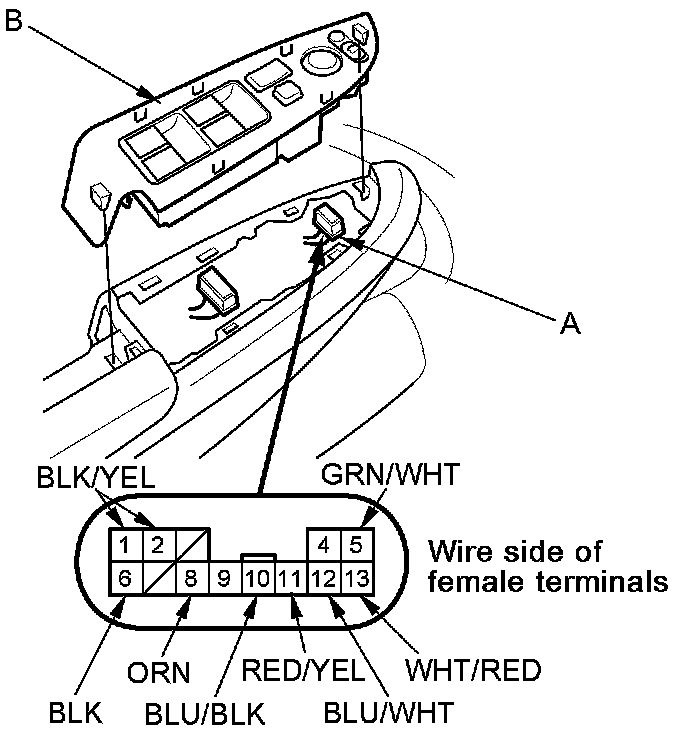 2. Disconnect the 13P connector (A) from the power mirror switch (B), and inspect the terminals. If OK, go to step 3.