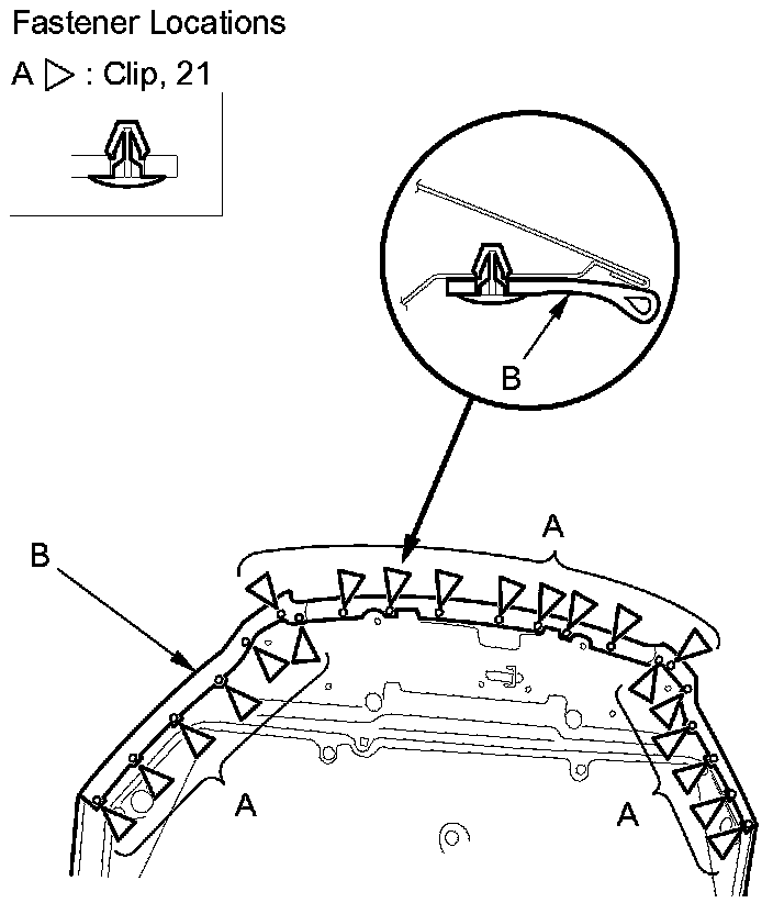 2. Except '07 Canada models: Detach the clips (A) with a clip remover, then remove the hood seal (B). Take care not to scratch the hood.