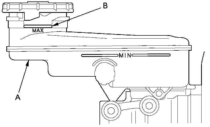 1. Make sure the brake fluid level in the reservoir (A) is at the MAX (upper) level line (B).