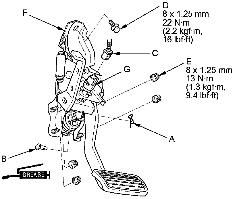 3. Remove the brake pedal bracket mounting bolt (D) and nuts (E).