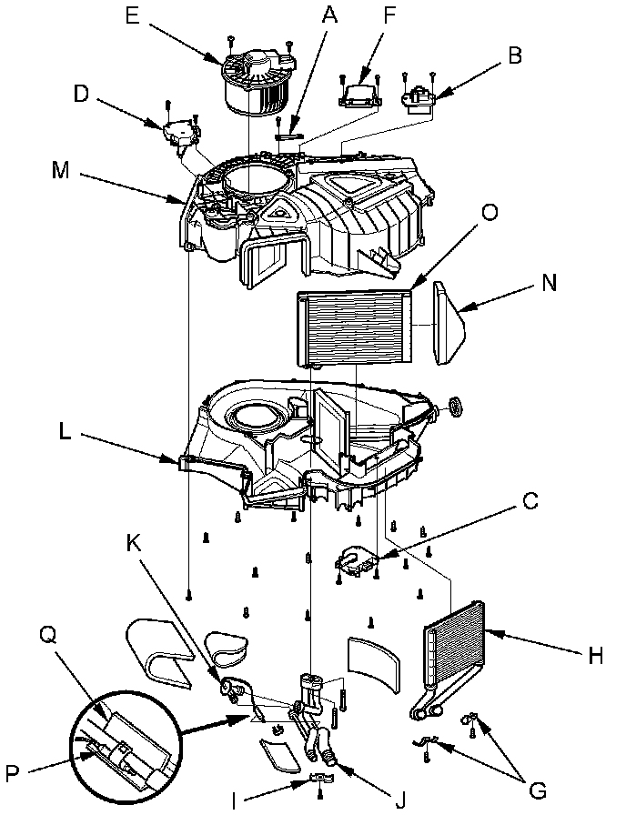 3. Remove the self-tapping screws, carefully separate the right housing (L) from the left housing (M), then remove the insulator (N) and the rear evaporator core (O).