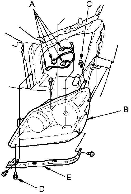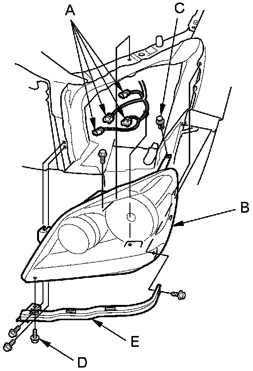 4. Remove the bolt (D) and the corner upper beam (E) from the headlight.